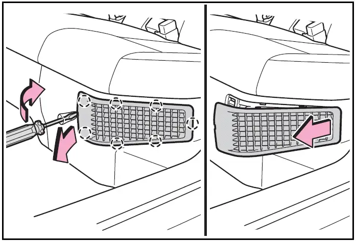 Pull the cover as shown in the illustration to disengage the 7 claws, starting from the claw in the upper right corner and pull the cover toward the front of the vehicle to remove it.